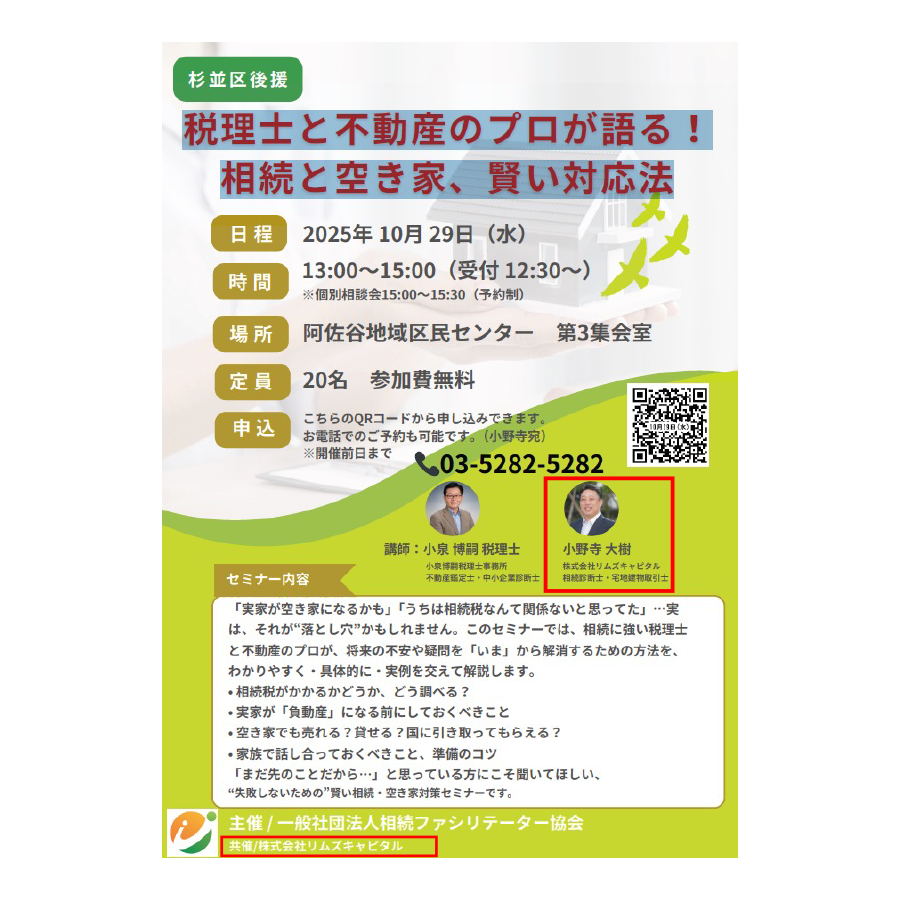 相続税の専門である小泉税理士とリムズキャピタルとで相続税・空き家対策について第二回目の講演を開催致します。